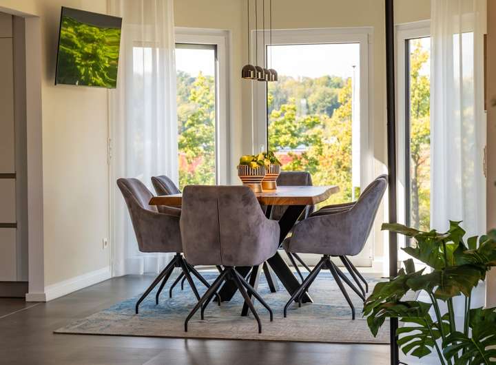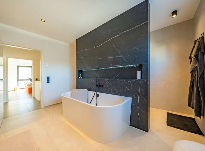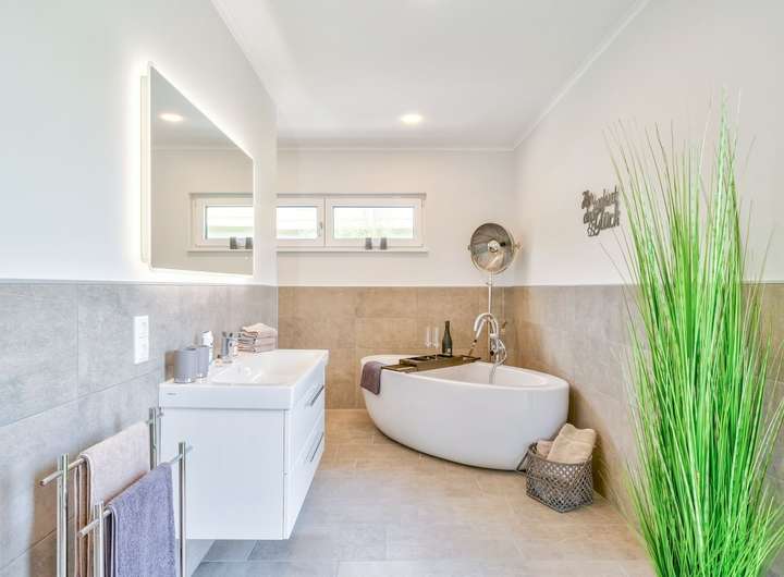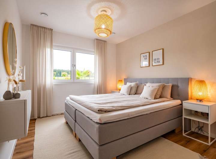 Erleben Sie gehobene Ausstattung, die keine Wünsche offenlässt. Der Bungalow verfügt über zwei Schlafzimmer und ein luxuriöses Badezimmer mit Dusche, Wanne und Fenster sowie ein zusätzliches Gäste-WC. Die Bodenbeläge sind wahlweise aus hochwertigen Fliesen oder nach Ihren individuellen Vorstellungen gestaltbar, was Ihrem Zuhause eine persönliche Note verleiht. Eine moderne Wärmepumpe sorgt für effiziente Beheizung und erfüllt den KFW40 Standard, was Ihnen langfristig Energiekosten spart,plus BNK.