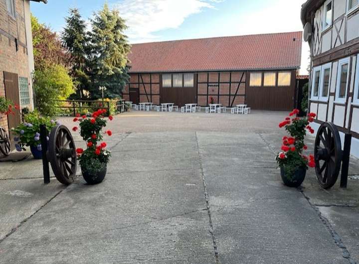Auf dem Hof befinden sich 6 Pferdeboxen (mit Traktor befahrbar), Sattelkammer, Reiterstube, Kutschengarage, Heulager und große Garage.