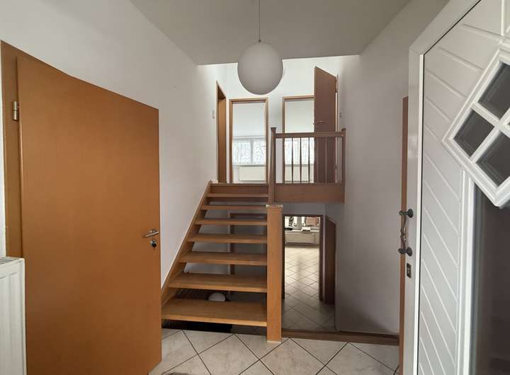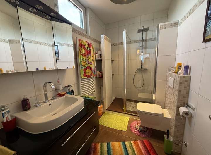 Im oberen Bereich des Hauses liegen zwei Schlafzimmer, ein modernes Badezimmer mit ebenerdiger Dusche, Einbauschrank und Spiegelschrank, sowie ein praktischer Abstellraum. Der Boden im Obergeschoss wurde im Jahr 2024 mit neuem Laminat versehen, während im Eingangsbereich und Erdgeschoss pflegeleichte Fliesen verlegt sind. Ein Kriechkeller bietet zusätzlichen Stauraum.