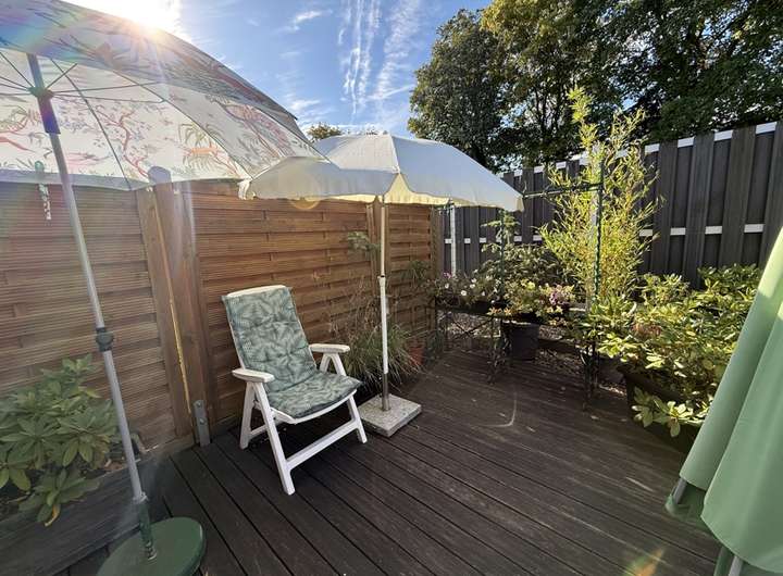 Der Außenbereich überzeugt mit einem pflegeleichten Garten auf einer Fläche von etwa 314 m², der überwiegend mit Steinen gestaltet ist und somit nur wenig Pflegeaufwand erfordert. Zwei Gartenhütten bieten Platz für Gartengeräte oder Freizeitaktivitäten, und ein gemeinschaftlich genutzter Außenraum steht ebenfalls zur Verfügung. Eine Garage gehört ebenfalls zum Haus und rundet das Angebot ab.