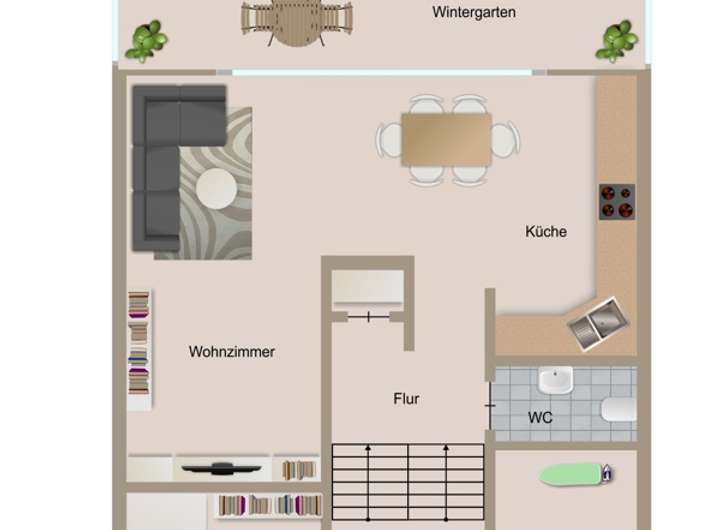 Beim Betreten des Hauses befinden sich auf der oberen Eingangsebene ein Gästezimmer bzw. Arbeitszimmer sowie der Hauswirtschaftsraum. Einige Stufen führen hinunter in die Wohnebene, die den Mittelpunkt des Hauses bildet. Hier befindet sich der offene Wohn- und Essbereich mit Einbauküche inklusive E-Geräte sowie Zugang zum Wintergarten und zur Terrasse, die den Blick in den pflegeleicht angelegten Garten eröffnet. Der im Flur platzierte Ofen sorgt in der kühleren Jahreszeit für angenehme Wärme und schafft eine wohnliche Atmosphäre. Ein modernes Gäste-WC ergänzt diesen Bereich.