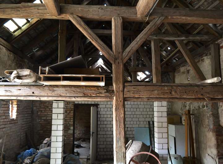 Es umfasst zwei Wohneinheiten, ca. 231 m² Gewerbefläche sowie zusätzliche Nutzfläche im Keller, Dachboden und in einer großen Scheune mit eigenem Keller. Zwar besteht Sanierungsbedarf – vor allem durch Dachschäden –, doch der Dachstuhl ist laut Fachbegutachtung intakt.