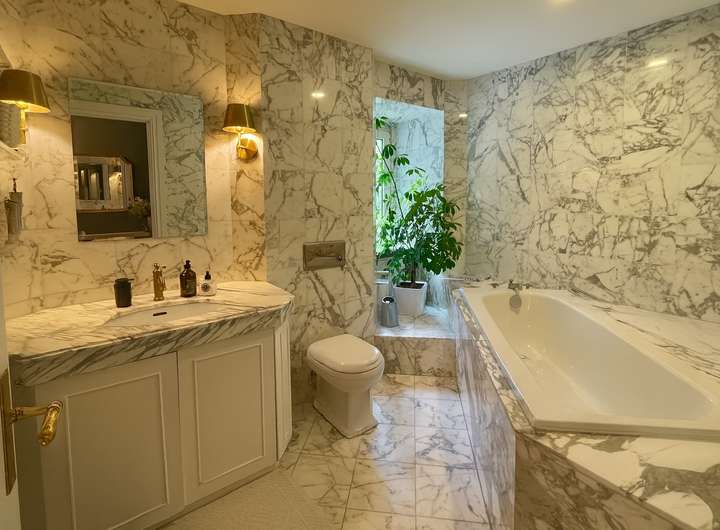 Die darüberliegende Maisonette-Wohnung erstreckt sich über zwei Etagen und beeindruckt durch großzügige, lichtdurchflutete Räume und hochwertige Ausstattungsdetails. Zwei miteinander verbundene Wohnzimmer mit Kamin öffnen sich zur weitläufigen Dachterrasse und schaffen ein außergewöhnliches Wohnambiente. Ergänzt werden sie durch ein elegantes Esszimmer, eine moderne, voll ausgestattete Wohnküche, ein repräsentatives Arbeitszimmer sowie ein stilvolles Vollbad aus Marmor. Im zweiten Obergeschoss befinden sich vier weitere Schlafzimmer und ein Duschbad mit Doppelwaschtisch, wodurch die Einheit optimal auf Familienbedürfnisse zugeschnitten ist.