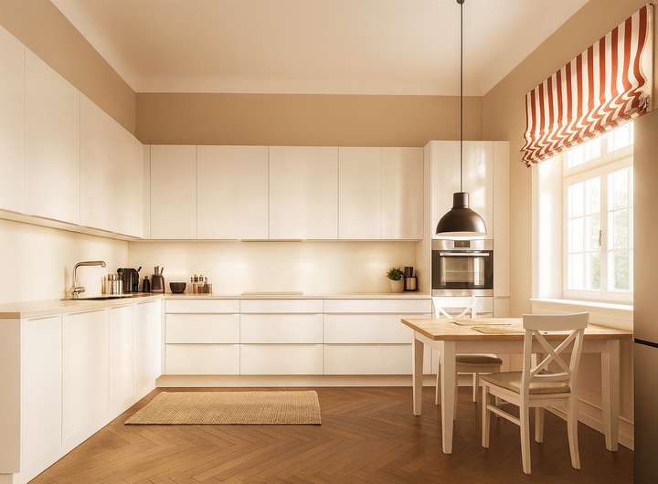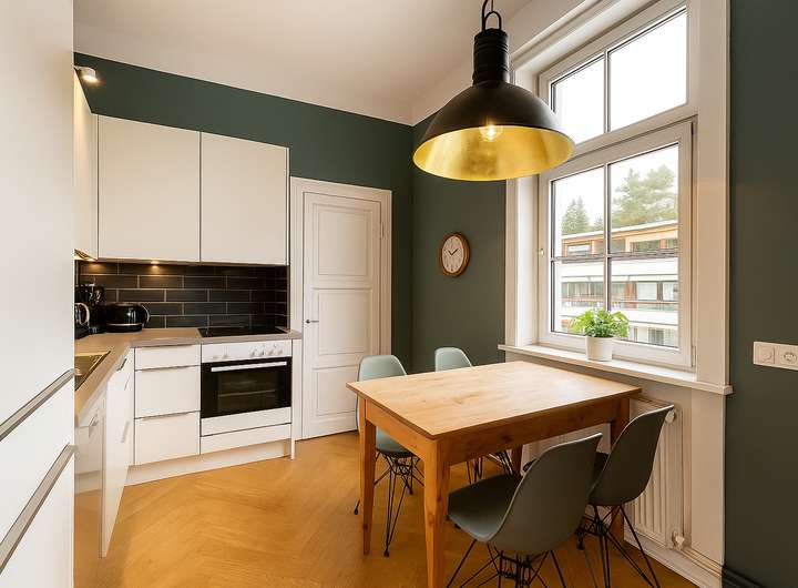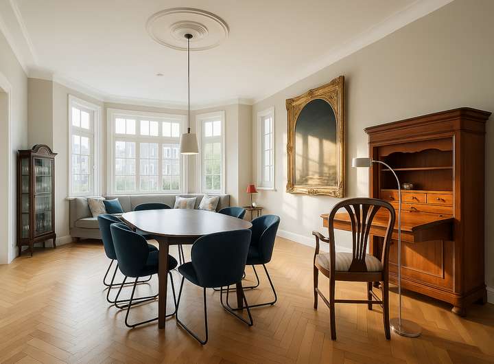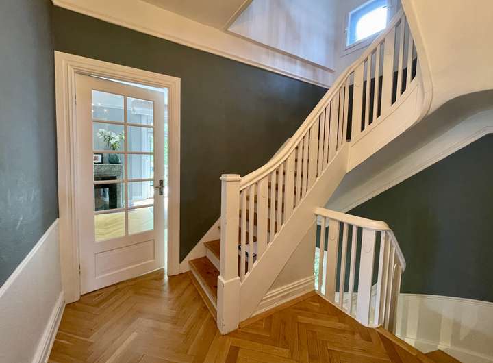 Die Ausstattung der Stadtvilla ist geprägt von klassischen Holzböden, teils in edlem Fischgrätparkett, die den Wohnräumen eine warme und hochwertige Anmutung verleihen. Hohe Decken unterstreichen den großzügigen Altbaucharakter. Die Bäder sind mit Marmor bzw. hochwertigen Fliesen ausgestattet und vermitteln ein elegantes, zeitloses Ambiente. Charmante Holz- und Sprossenfenster runden das stilvolle Gesamtbild ab und sorgen für eine helle, freundliche Wohnatmosphäre.