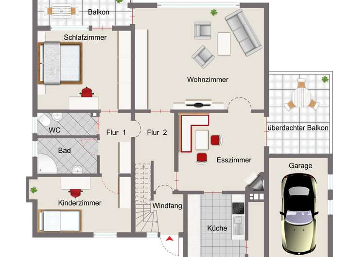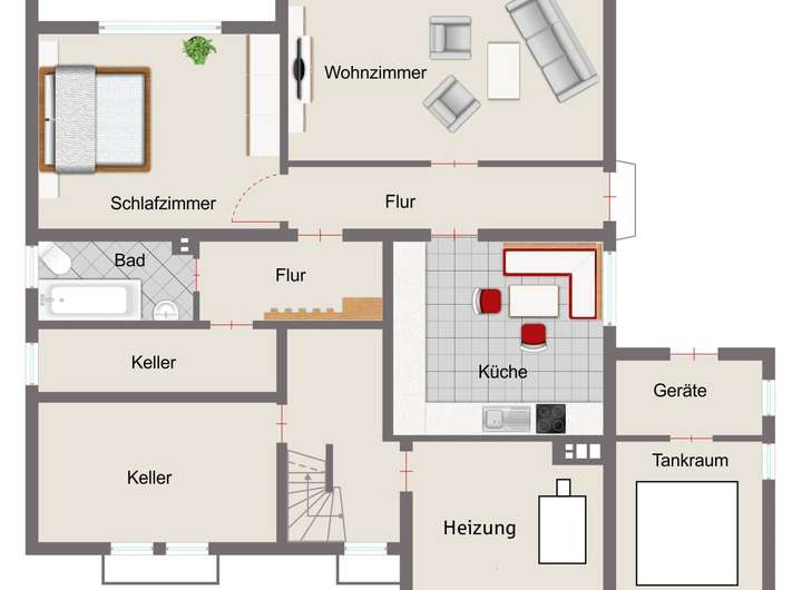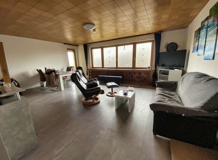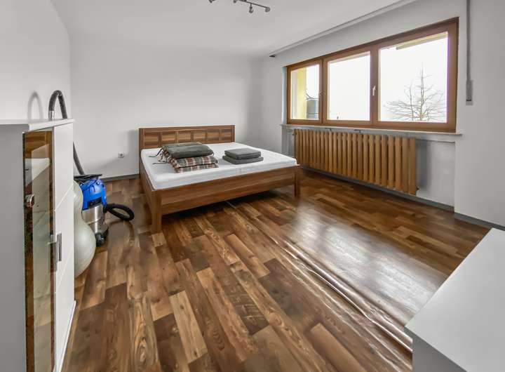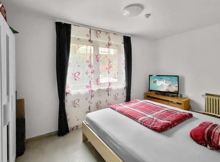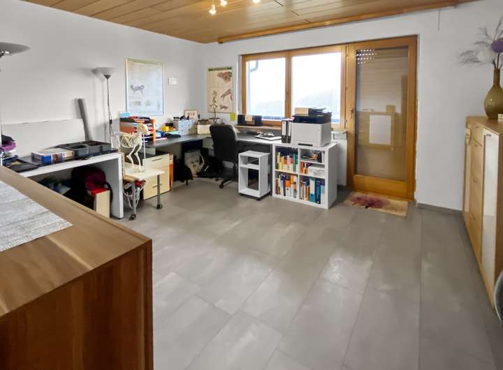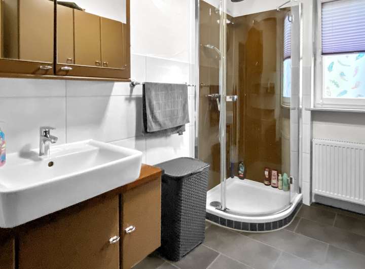 Über einen separaten Eingang im Hanggeschoss gelangen Sie in die Einliegerwohnung, die mit zwei Zimmern, einer Küche, einem Flur, einem Tageslichtbad und einem eigenen Abstellraum ausgestattet ist.