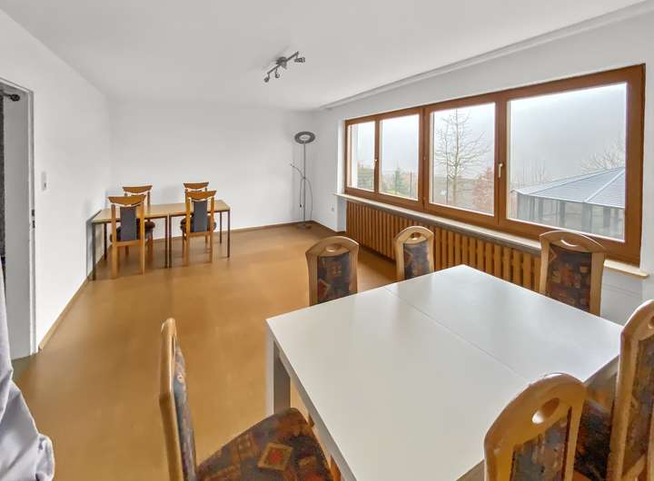 Im Erdgeschoss erwartet Sie ein großzügiger Grundriss mit vier Zimmern, einer separaten Kochküche mit Speisekammer, einem modernen Tageslichtbad mit Dusche (ca. 2011 renoviert) und einem separaten WC. Sowohl ein geschlossener als auch ein offener Balkon bieten zusätzliche Rückzugsorte. Besonders hervorzuheben ist das helle und geräumige Wohnzimmer, das mit einen traumhaften Aussicht auf den Spessartwald glänzt und Zugang zum offenen Balkon bietet. Ein angrenzendes Kamin-/Esszimmer mit einem modernen Heizkamin (Baujahr 2021) schafft eine gemütliche Atmosphäre, ideal zum Entspannen und Verweilen.