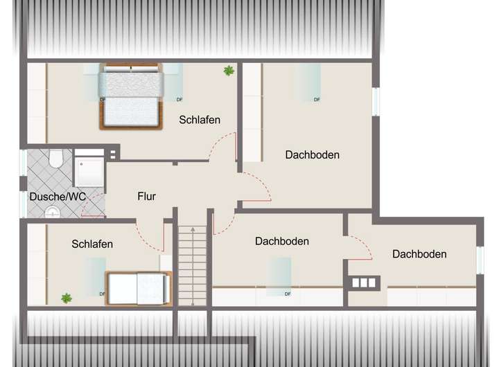 Im Dachgeschoss befinden sich vier weitere Zimmer, eine Küche und ein Bad. Bitte beachten Sie, dass die Küche sowie zwei Zimmer nicht in die Wohnflächenberechnung einfließen.