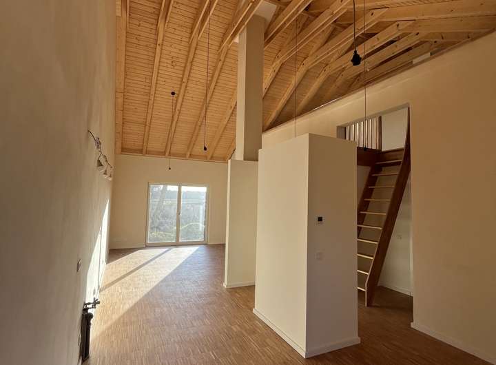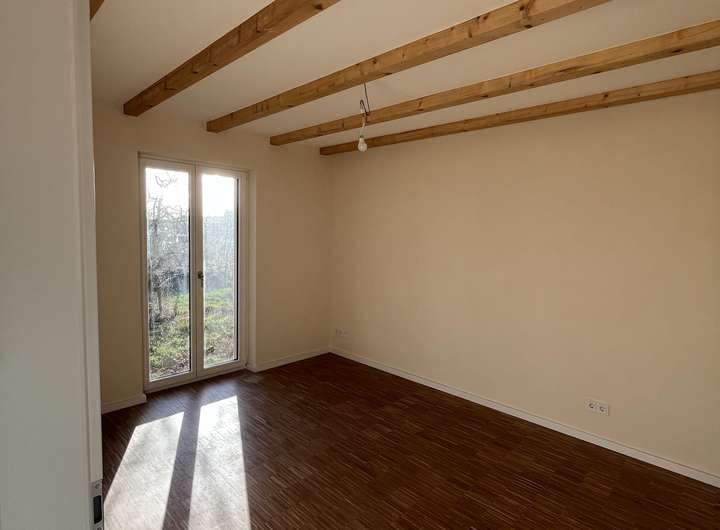 Dreifach verglaste Fenster, Parkettboden, Fußbodenheizung, Lehmverputzung, schadstoffarmer Bau,