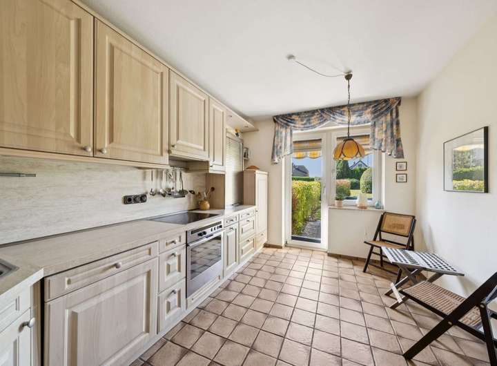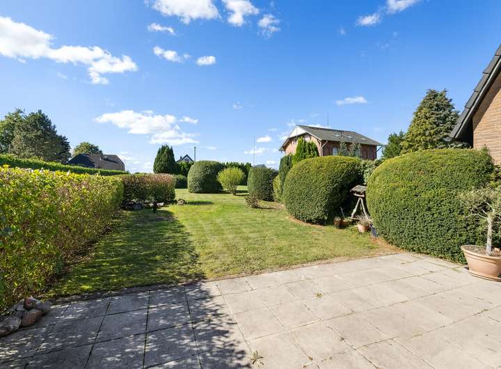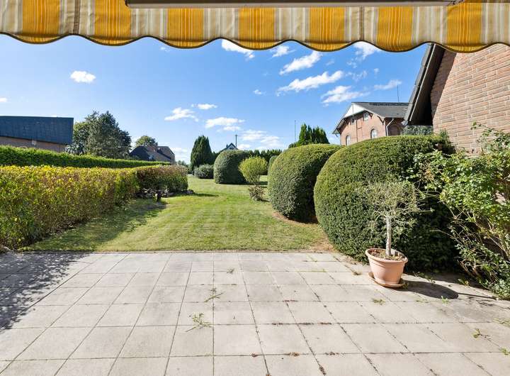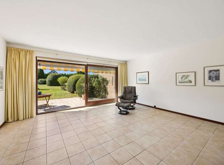 Zentraler Mittelpunkt ist der ca. 30 m² große Wohn-Essbereich. Er ist lichtdurchflutet durch eine über die gesamte Breite des Raumes gehende Fensterfront mit großer Terrassenschiebetür. Davor liegt die ca. 30 m² große, nicht einsehbare Terrasse mit perfekter Südwest Ausrichtung, auf der Sie in aller Ruhe die Sonnenstunden genießen oder unter der Markise im Schatten sitzen können. Daran schließt sich der weitläufige, gepflegte Garten an.