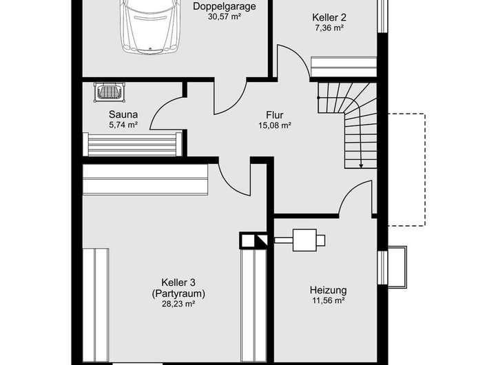 Das Haus ist vollständig unterkellert. Hier finden Sie einen ca. 30 m² großen Partyraum, einen Hauswirtschaftsraum, eine Sauna und ausreichend Abstellfläche.
