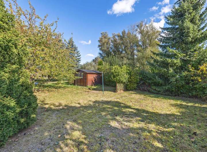 Hieran schließt sich der idyllische, hintere Gartenbereich mit Obstbäumen und einem großen Holzschuppen an.