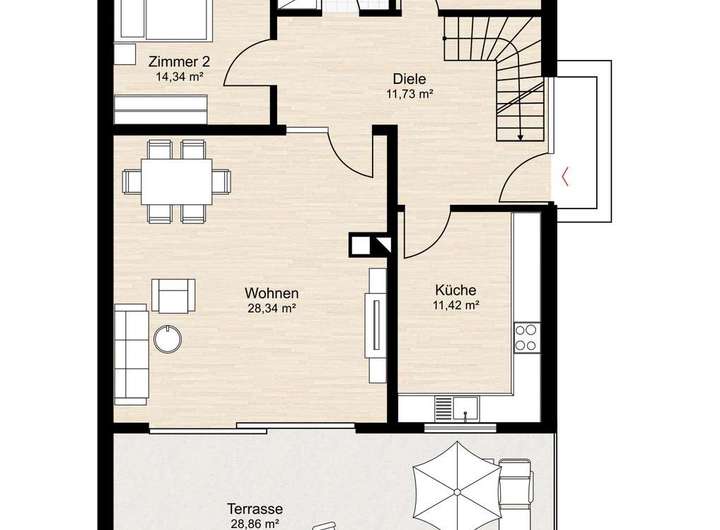 Direkt neben dem Wohn-Essbereich liegt die Küche, die ebenfalls über eine Tür zur Terrasse hin geöffnet werden kann. Wenn Sie einen modernen Grundriss mit offener Küche gestalten wollen, besteht hier eine gute Möglichkeit dazu. Zusätzlich bietet das Erdgeschoss ein schönes, großes zum hinteren Garten ausgerichtetes Schlafzimmer mit ca. 14 m², sowie ein kleineres Zimmer, das sich hervorragend als Gäste-, Arbeits- oder Kinderzimmer eignet.
