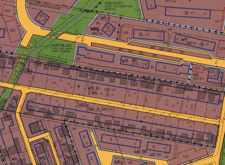 Nach dem gültigen Bebauungsplan Billstedt 90 I ist eine offene Bauweise mit einem Vollgeschoss zulässig. Darüber hinaus kann das Dachgeschoss ausgebaut werden, sofern es nicht als Vollgeschoss zählt und die geltende Geschossflächenzahl eingehalten wird. Die maximale Grundflächenzahl beträgt ca. 0,3. Das Baufenster liegt im nördlichen Teil des Grundstücks und umfasst ca. 12 m in der Breite sowie ca. 15 m in der Tiefe – verbunden mit einem großzügigen Südgarten. Damit bietet das Grundstück die Möglichkeit, entweder ein großzügiges Einfamilienhaus oder ein modernes Doppelhaus zu errichten.