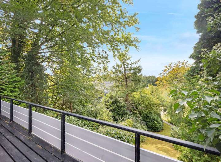Der Wohnbereich wird durch drei großzügige Schlafzimmer (je ca. 14, 15, 20 m²) ergänzt, die alle einen bezaubernden Blick ins Grüne bieten. Das Tageslichtbad mit Wanne und Dusche sowie ein separates Gäste-WC vervollständigen das Raumangebot auf dieser Ebene.