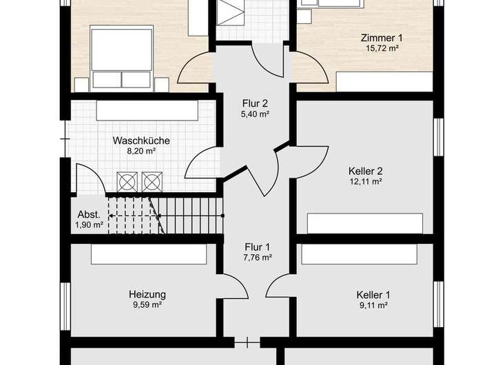 Zusätzlich befinden sich im hangseitigen Bereich des Untergeschosses drei geräumige Kellerräume, die reichlich Abstellfläche bieten.