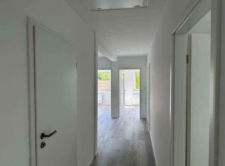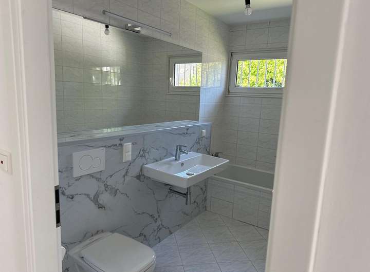 Desweiteren befinden sich auf dieser Ebene 5 Zimmer, die man individuell nutzen kann, ob als Schlafzimmer, Arbeitszimmer, Kinder oder Gästezimmer . Das Badezimmer ist mit einer Badewanne ausgestattet sowie einem Handtuchheizkörper und einem großzügigem Wandspiegel. Im Eingangsbereich befindet sich noch ein Gäste-WC und ein weiteres Badezimmer mit Dusche befindet sich im unteren Geschoss.