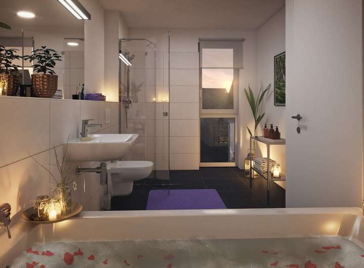 - Voll ausgestattetes Tageslichtbadezimmer mit Badewanne und bodengleicher Dusche inkl. Boden- und Wandfliesen