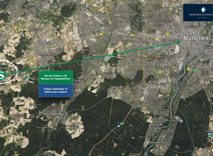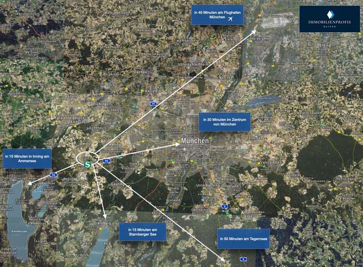 - ca. 15 Minuten zur S-Bahn Haltestelle Gilching-Argelsried - mit der S8 in 25 Fahrminuten am Hauptbahnhof München!
