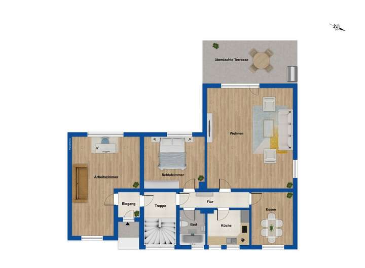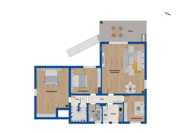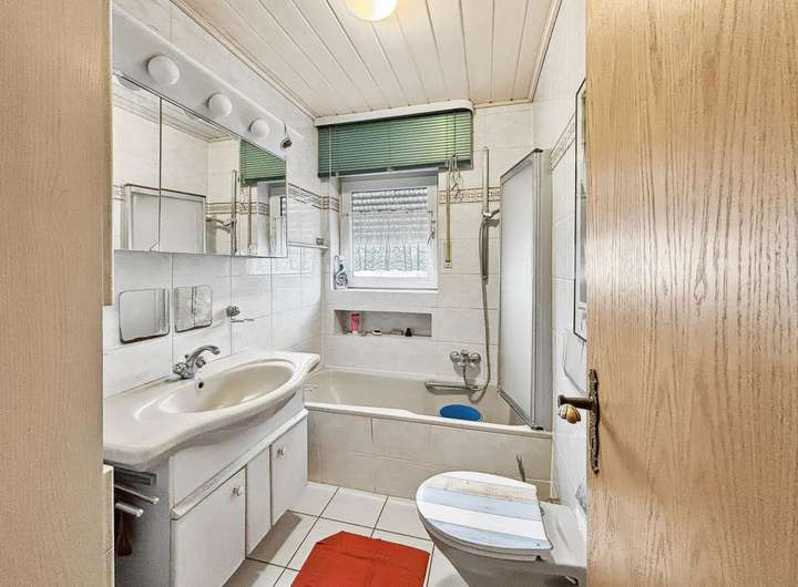 Im 1. Obergeschoss befindet sich eine Wohnung mit identischem Grundriss wie im Erdgeschoss. Diese Ebene ist aktuell mit dem 2. Obergeschoss verbunden, kann jedoch bei Bedarf wieder in zwei eigenständige Wohneinheiten getrennt werden.