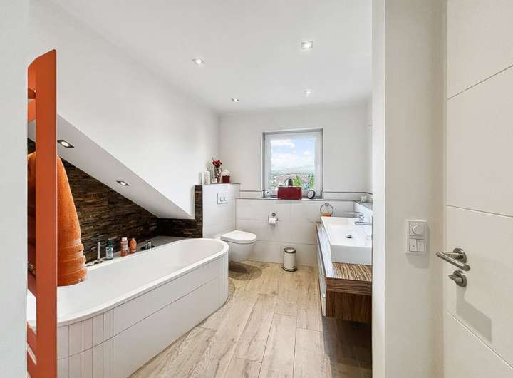Der Anbau ist im Erdgeschoss separat zugänglich und im 1. Obergeschoss mit dem Haupthaus verbunden. Auch hier besteht die Möglichkeit, die Ebenen miteinander zu verbinden und eine eigenständige Wohneinheit über zwei Etagen zu schaffen oder den Anbau vollständig zu separieren.