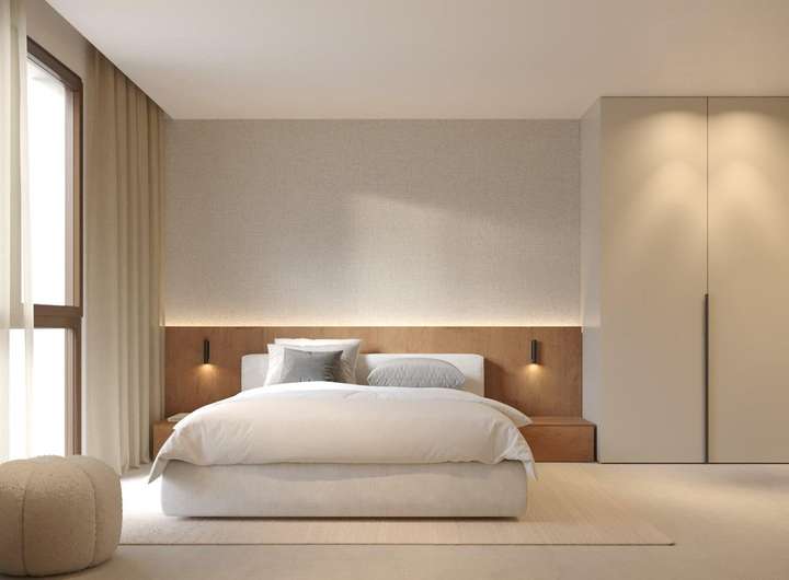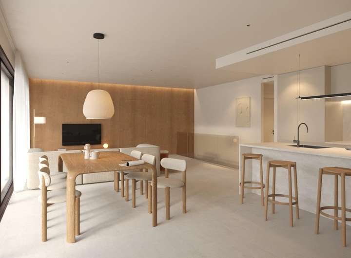 Im Inneren bieten die Villen einen hellen und eleganten offenen Wohn- und Essbereich mit einer modernen integrierten Küche und einer Halbinsel. Große Schiebetüren mit versenkten Schienen schaffen einen nahtlosen Übergang zwischen Innen- und Außenbereich und bieten direkten Zugang zum Garten, zum Pool und zum Parkplatz. Diese durchdachte Raumaufteilung verstärkt das natürliche Licht und schafft eine einladende Atmosphäre für das tägliche Leben und die Unterhaltung.