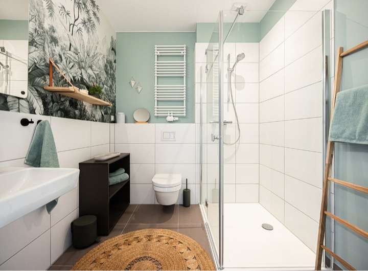 Eine gehobene Innenausstattung sowie zwei moderne Bäder sorgen für hohen Wohnkomfort: Im Obergeschoss befindet sich ein großzügiges Bad mit Badewanne und separater Dusche, im Dachgeschoss ein weiteres Duschbad. Ergänzt wird das Raumangebot durch ein separates Gäste-WC im Erdgeschoss, ideal für Familie und Besucher.