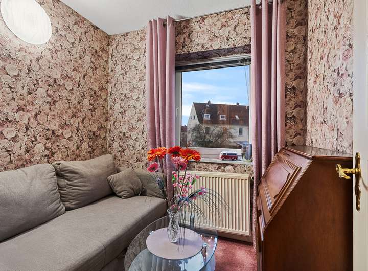 Im Obergeschoss befinden sich zwei Schlafzimmer sowie ein zusätzliches Arbeitszimmer, das sich flexibel auch als Kinder- oder Gästezimmer nutzen lässt. Das Tageslichtbad im Obergeschoss verfügt ebenfalls über ein Fenster.