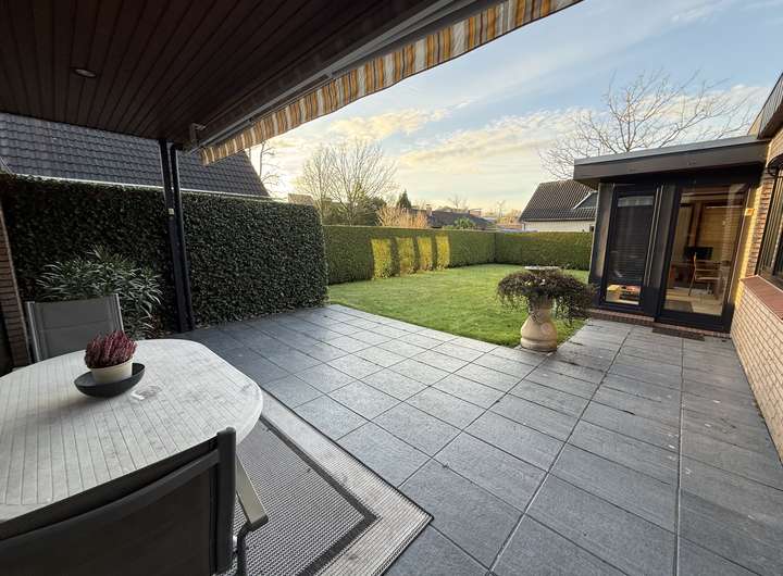 Vom Wohnbereich aus gelangt man direkt auf die Terrasse, die mit einer elektrischen Markise ausgestattet ist und einen schönen Blick in den gepflegten Garten bietet. Dieser Außenbereich lädt zum Entspannen, Verweilen und zu geselligen Stunden im Freien ein.