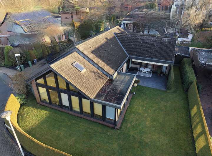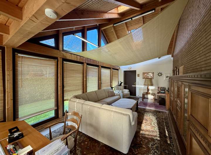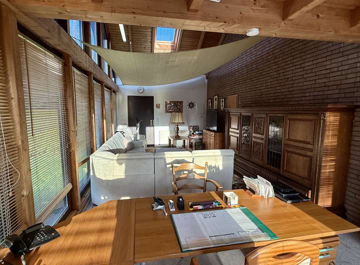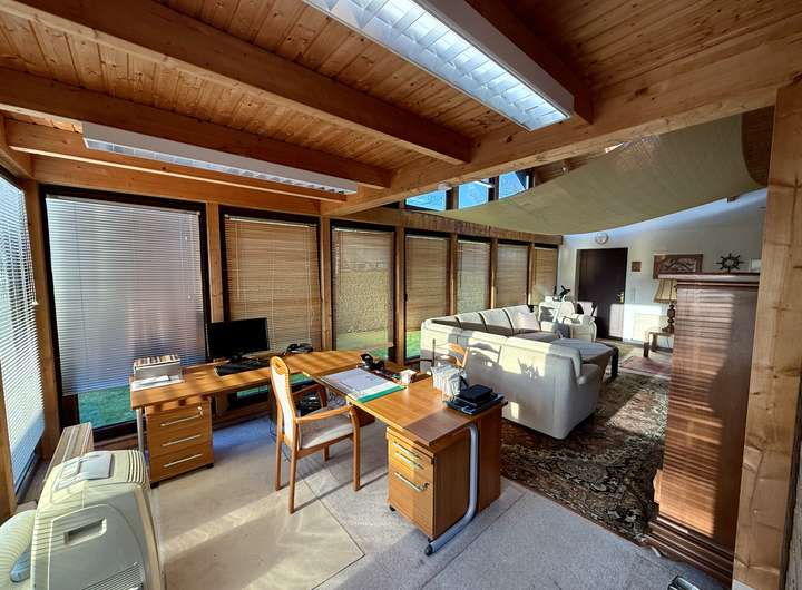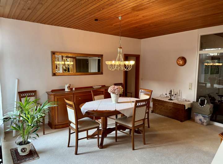 Das Ursprungshaus aus dem Jahr 1978 verfügt über helle und gut geschnittene Räume. Mittelpunkt des Hauses ist der großzügige Wohnbereich, der durch große Fensterflächen viel Tageslicht erhält. Neben einem gemütlichen Wohnbereich ist hier ausreichend Platz für einen großzügigen Essbereich, sodass Wohnen und Essen harmonisch miteinander verbunden werden können. Ein Kamin sorgt zusätzlich für eine behagliche Atmosphäre und erhöht den Wohnkomfort.