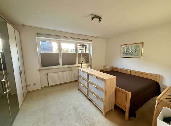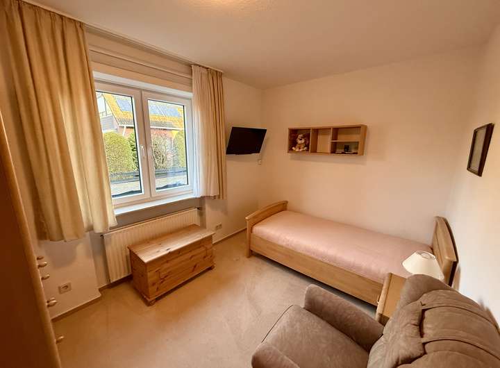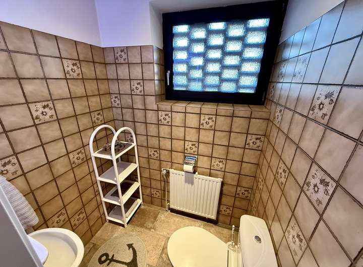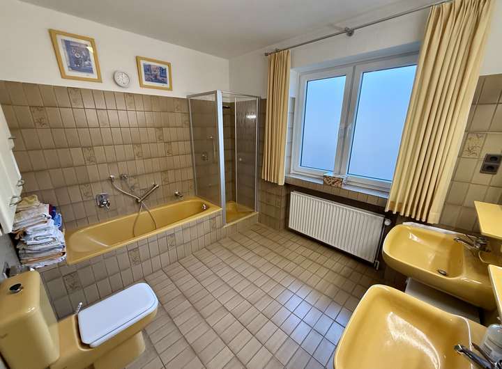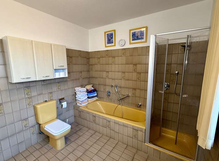 Neben dem Wohnbereich stehen ein Schlafzimmer sowie ein weiteres kleines Schlafzimmer oder ein kleines Büro bzw. Arbeitszimmer zur Verfügung. Das Badezimmer stammt aus dem Baujahr 1978 und bietet Potenzial zur individuellen Modernisierung. Ergänzt wird das Raumangebot durch ein separates Gäste-WC sowie einen Windfang, der für einen angenehmen Eingangsbereich sorgt.