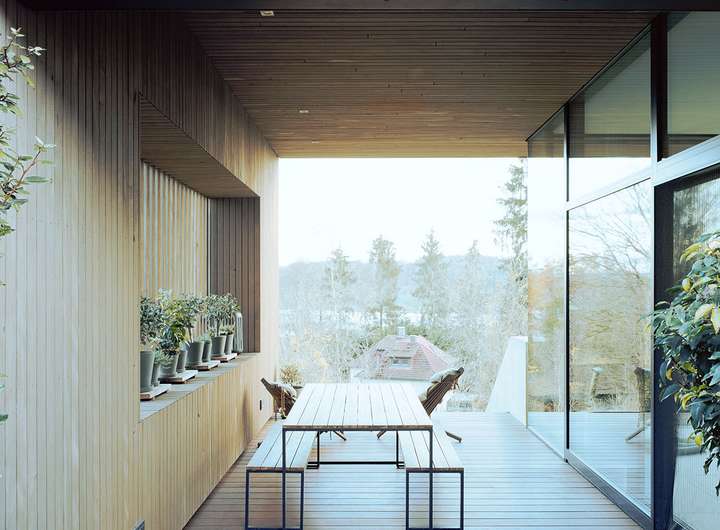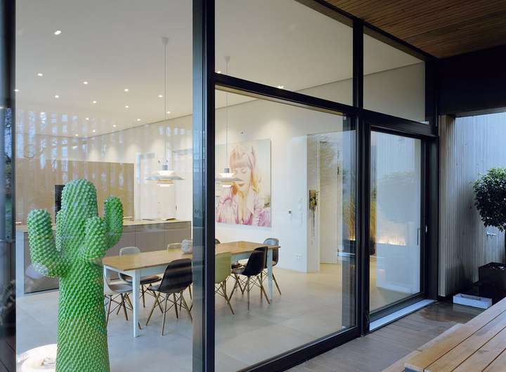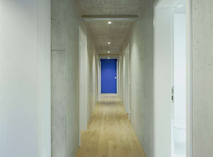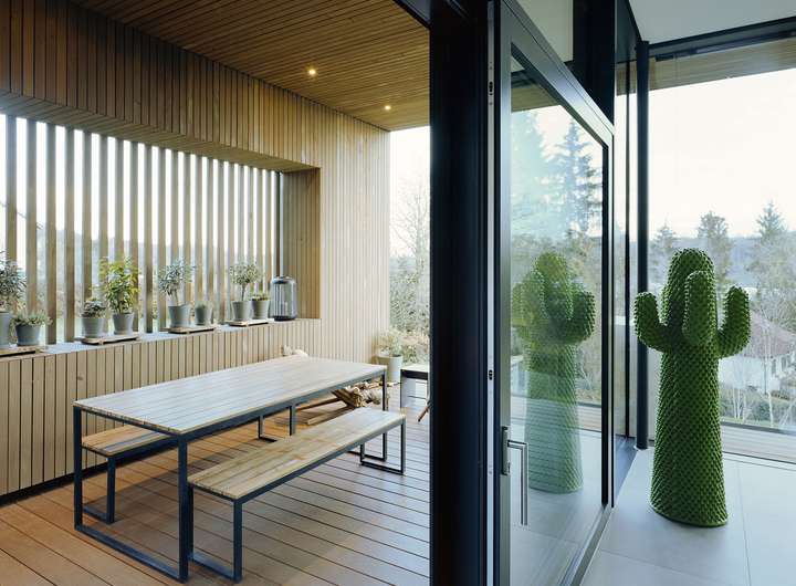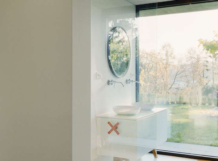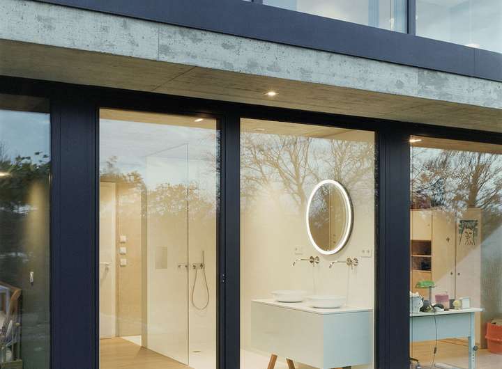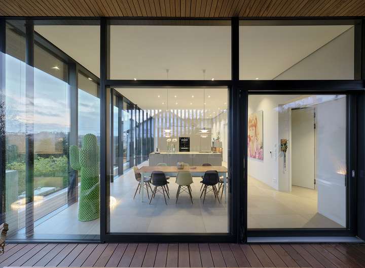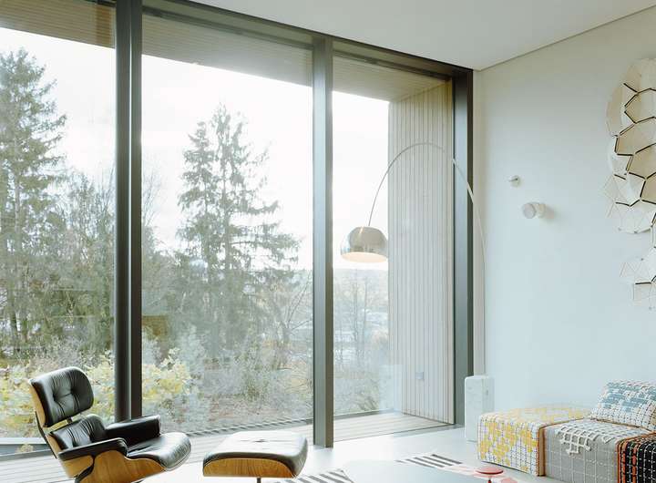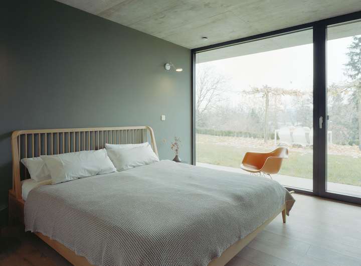 Im Inneren setzt sich die kompromisslose Ästhetik fort. Großzügige Raumhöhen und bodentiefe Verglasungen schaffen eine helle, einladende Atmosphäre. Die Architektur folgt einem klaren Konzept: Während sich das Haus zum Garten und zur Aussicht hin öffnet, garantiert die bewusst fensterlose Nordseite ein Maximum an Privatsphäre.