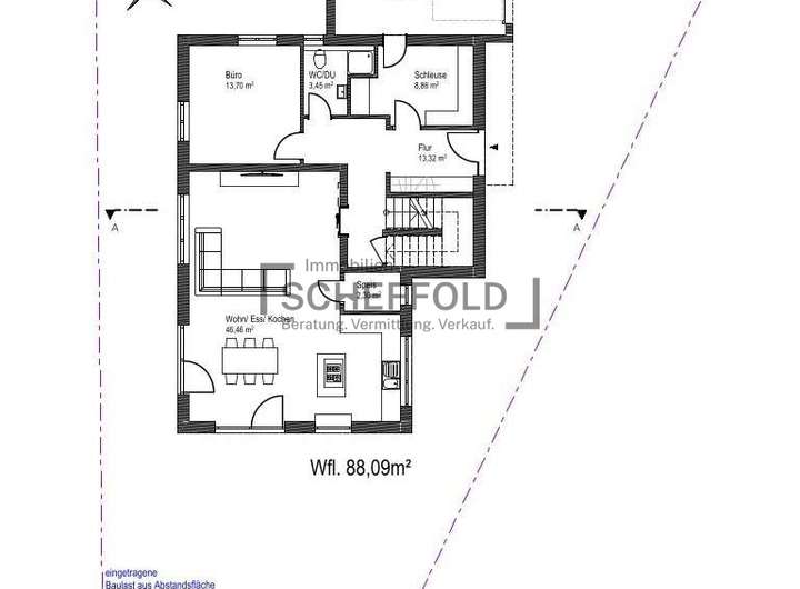 Eine erste Analyse hat eine mögliche Bebauung mit einem Ein- bis Zweifamilienhaus mit 1,5 Geschossen und rund 140 m² Wohnfläche ergeben. Zudem hätte auf der Grenze im Nordwesten noch eine Garage ihren Platz.