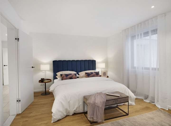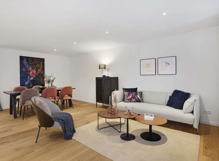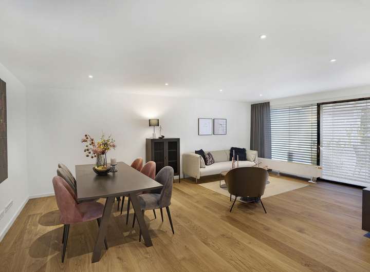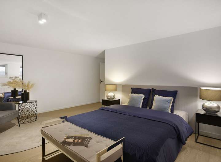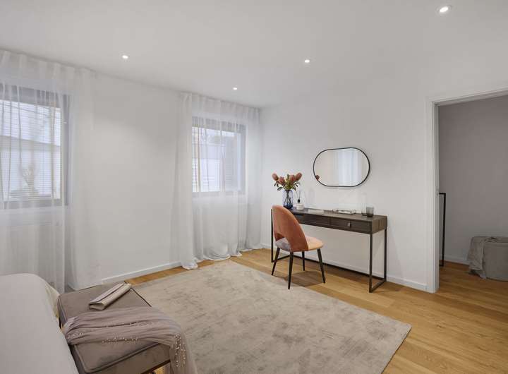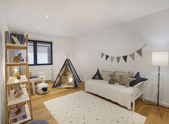 Die gesamte Wohnebene besticht durch dreifach verglaste Fenster mit Innenjalousien, ein durchdachtes Lichtkonzept, hochwertige Bodenbeläge und eine klare Gestaltung, die Funktionalität und Komfort vereint.