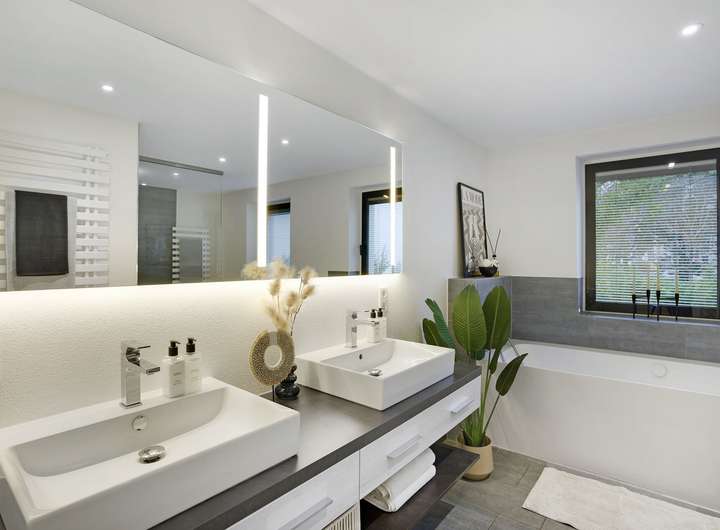Das Haus überzeugt energetisch mit Energieklasse A+ (30 kWh/m²a), einer PV-Anlage mit Batteriespeicher (modular erweiterbar) und einer vollständig isolierten Gebäudehülle. Ergänzend bietet es Fußbodenheizung im Bad und Flur, hochwertige Heizkörper in allen Wohnräumen, Glasfaseranschluss, durchdachte Medienverkabelung in allen Räumen und ein modernes Beleuchtungssystem. Insgesamt wurden rund 8 km neue Kabel verbaut, die eine zukunftssichere Infrastruktur garantieren.