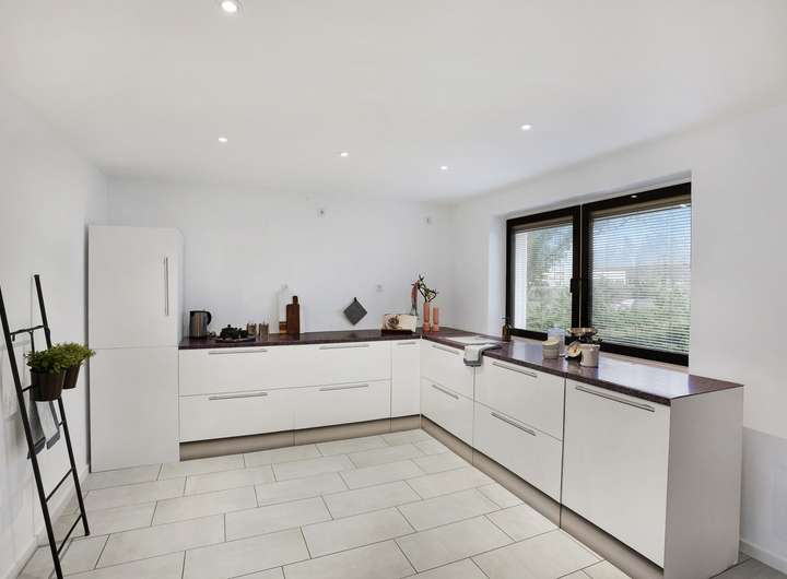 Im Inneren erwartet Sie eine helle Diele. Der L-förmige Flur verbindet die moderne, lichtdurchflutete Küche direkt mit dem großzügigen Wohn- und Esszimmer. Große Fensterflächen, elegante Lichtspots und eine Glasschiebetür zur Terrasse schaffen ein harmonisches, offenes Wohngefühl – das Herzstück des Hauses.