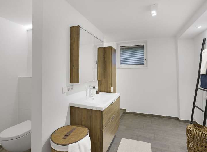 Über die Treppe im Eingangsbereich gelangt man in das vollwertige Untergeschoss, das in seiner Ausstattung der oberen Etage in nichts nachsteht. Hier befinden sich zwei weitere Kinder- oder Jugendzimmer, ein modernes Badezimmer mit Regendusche sowie ein separater Büro- oder Gästebereich mit eigenem Außenzugang – ideal für Homeoffice, Freiberufler oder Au-pair.