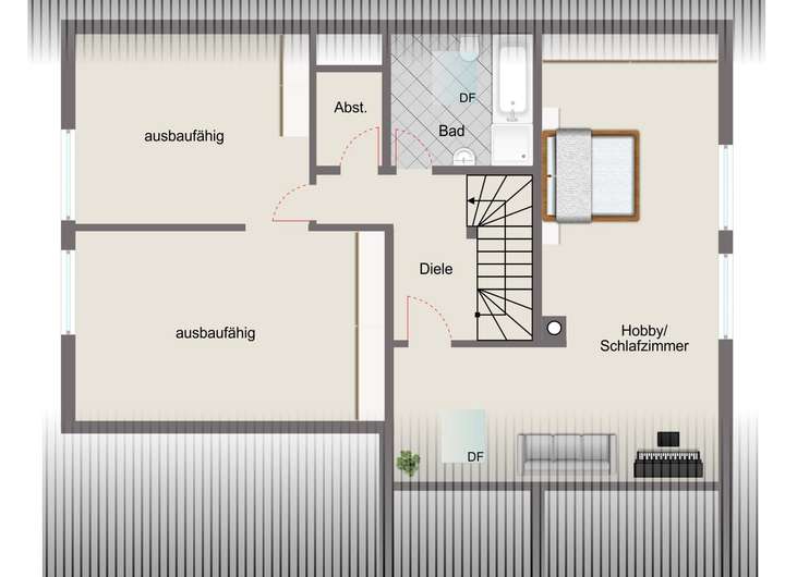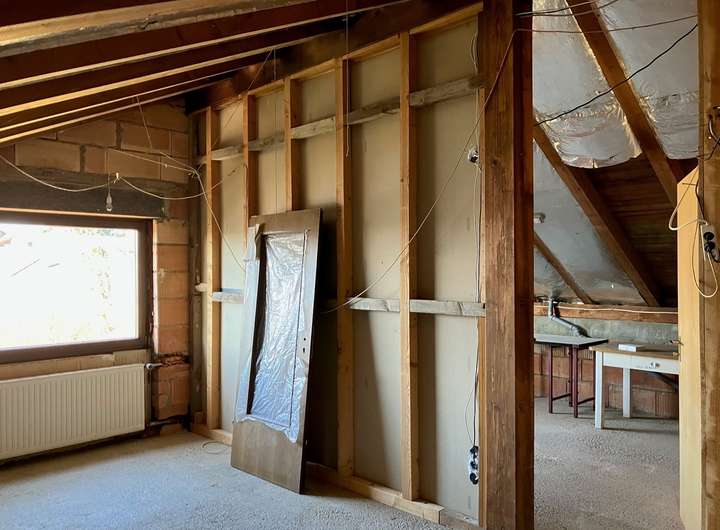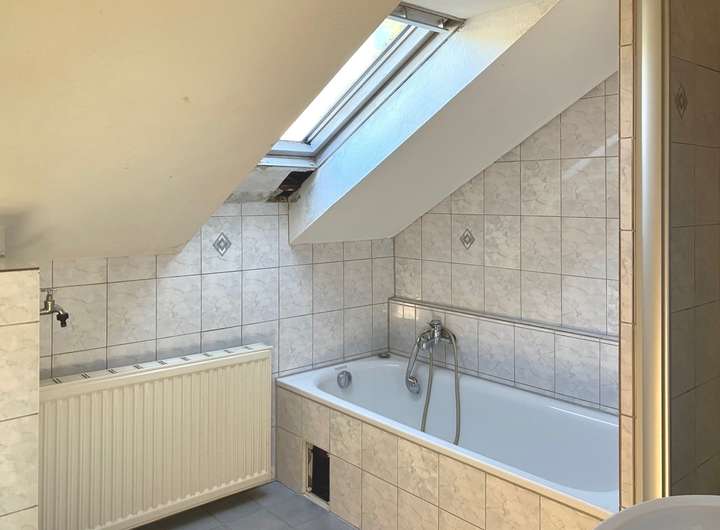 Im Dachgeschoss befindet sich bereits ein großzügig ausgebautes Zimmer, das sich ideal als Hobby-, Arbeits- oder Schlafzimmer eignet. Zusätzlich steht hier ein Badezimmer mit Badewanne zur Verfügung. Zwei weitere Räume befinden sich aktuell im Rohbauzustand, sind jedoch bereits mit Strom- und Heizungsanschlüssen vorbereitet und lassen sich problemlos zu weiterer Wohnfläche ausbauen.