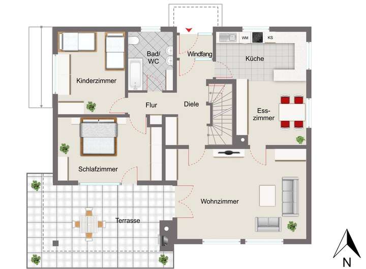 Ein besonderes Merkmal dieses Hauses ist die durchdachte Grundrissgestaltung, die komfortables Wohnen auf einer Ebene ermöglicht. Das Erdgeschoss bietet zwei Schlafzimmer, ein großzügiges Badezimmer, eine große Wohnküche sowie einen sonnigen, lichtdurchfluteten Wohnbereich mit direktem Zugang zur weitläufigen Terrasse. Diese ist teilweise überdacht und vermittelt ein echtes Urlaubsgefühl – ideal für entspannte Stunden im Freien.