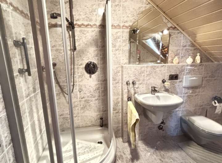 Badezimmer mit Dusche, WC und Waschtisch, das ebenfalls über ein Dachflächenfenster natürlich