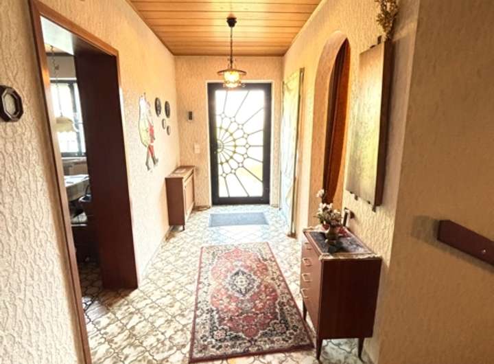 Beim Betreten des Hauses gelangt man zunächst in einen einladenden Flur, in dem sich auf der linken Seite eine praktische Garderobennische befindet. Daran schließt sich ein großzügiges Gäste-WC an, das mit maßgefertigten Einbauschränken zusätzlichen Stauraum bietet. Rechter Hand liegt die Küche, die ausreichend Platz für einen kleinen Essbereich bietet. Von hier aus gelangt man direkt in das angrenzende Esszimmer, das durch einen charmanten Rundbogen mit dem großzügigen Wohnzimmer verbunden ist. Zusätzlich lässt sich das Wohnzimmer auch direkt vom Flur aus betreten, was eine angenehme Offenheit und Flexibilität in der Raumaufteilung schafft. Das Esszimmer öffnet sich zur Terrasse und weiter in den liebevoll angelegten Garten, der an einen Anliegerweg grenzt und somit auch rückseitig bequem zugänglich ist. Die Terrasse verfügt im Sitzbereich über eine Überdachung und bietet damit auch bei wechselhaftem Wetter einen geschützten Platz im Freien – ideal für entspannte Stunden im Grünen oder gesellige Grillabende.