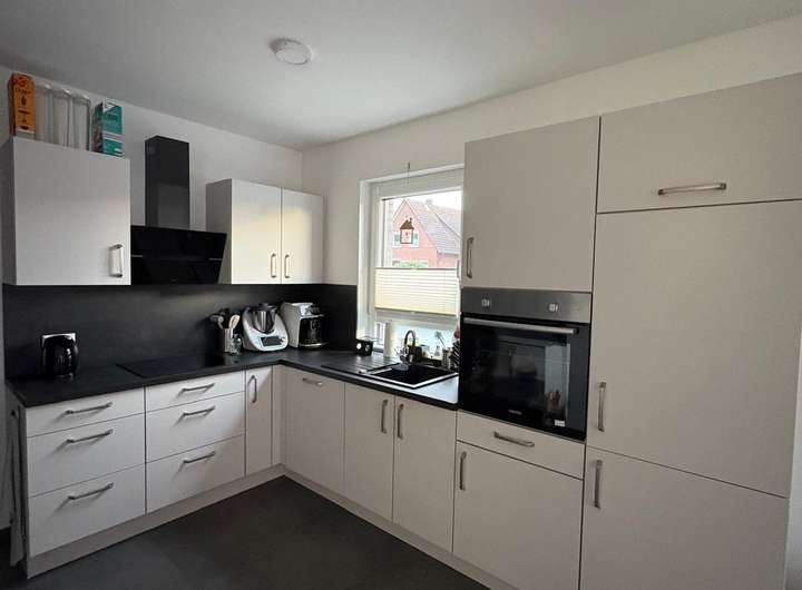 Der offene Wohn- und Essbereich integriert eine moderne, helle Einbauküche mit allen notwendigen Elektrogeräten – ideal für gemeinsames Kochen und gemütliches Beisammensein.