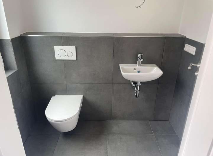 Das geschmackvoll geflieste Badezimmer in edlem Anthrazit verfügt über eine ebenerdige Dusche mit Glasabtrennung.