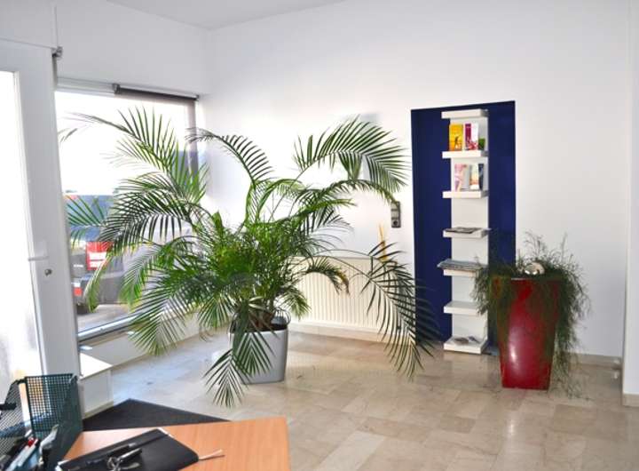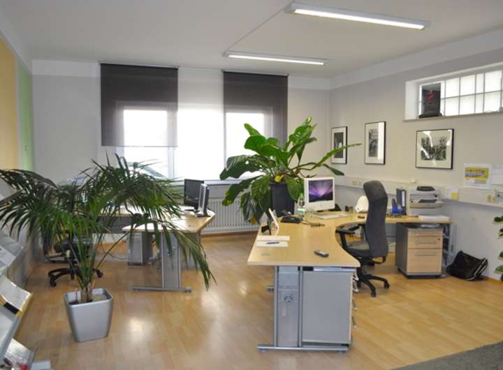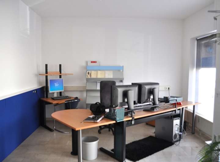 Das Ladenlokal im Erdgeschoss verfügt über einen Eingangsbereich mit zwei Schaufenstern, einen Flur, zwei große Büroräume, eine Teeküche, WC und ein Besprechungszimmer.