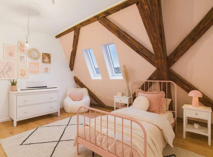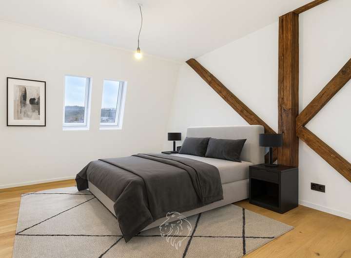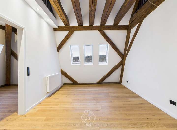 Auf ca. 178 m² Wohnfläche verteilen sich ein weitläufiger Wohn- und Essbereich mit sichtbaren Holzbalken und freigelegten Ziegelsteinen, eine moderne Wohnküche mit Zugang zum sonnigen Südbalkon und Blick auf den Main, mehrere flexibel nutzbare Zimmer, offene Galeriebereiche sowie ein ausgebautes Dachgeschoss. Zwei moderne Bäder mit Dusche bzw. Badewanne sorgen für einen hohen Wohnkomfort.