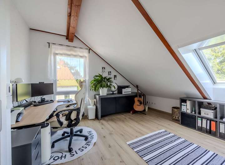 Im ausgebauten Dachgeschoss befinden sich zwei weitere, gut nutzbare Zimmer, perfekt für Kinder, Homeoffice oder Gäste und ein zweites Badezimmer. Außerdem gibt es auf der Etage einen kleinen Abstellraum.
