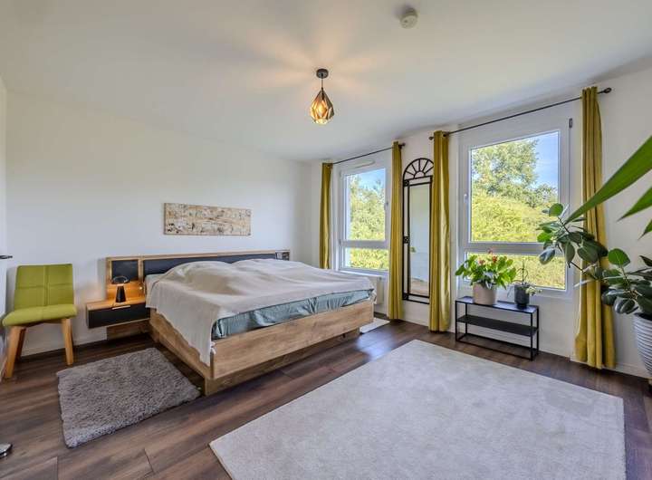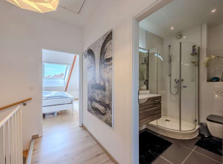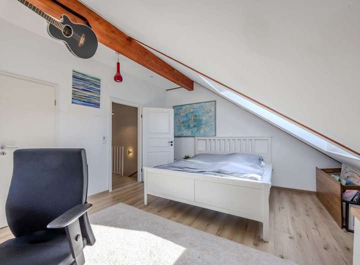 Das Obergeschoss bietet ein großzügiges Elternschlafzimmer sowie ein weiteres Schlafzimmer. Ergänzt wird die Ebene durch ein stilvolles Tageslichtbad mit Walk-In-Dusche und Badewanne auf höchstem Niveau (2023 saniert).