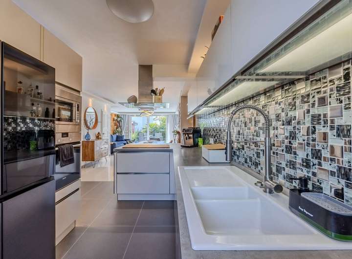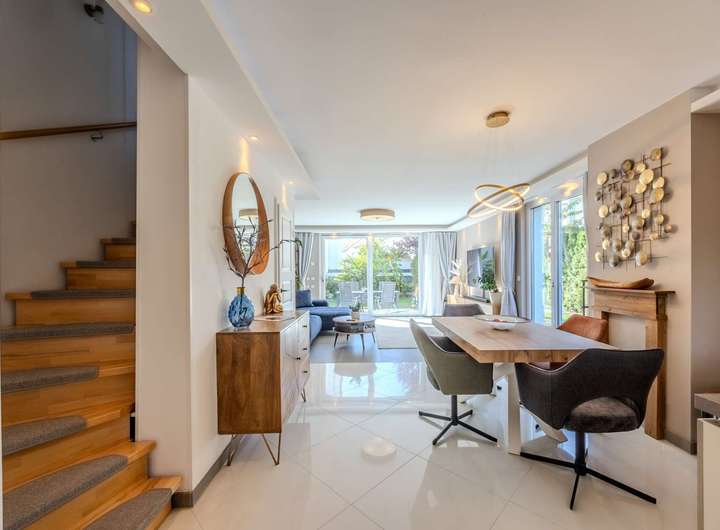 Im Erdgeschoss empfängt Sie ein einladender Eingangsbereich mit Gäste-WC, der in den weiten, offenen Wohn-/Essbereich überleitet. Die hochwertige, offene Einbauküche fügt sich harmonisch in den Wohn- und Essbereich ein. Bodentiefe Fenster öffnen den Blick auf Terrasse und Garten und schaffen ein helles, freundliches Wohnambiente.