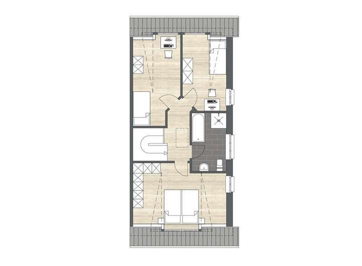 Ebenfalls im Erdgeschoss befinden sich die Küche, ein Hauswirtschaftsraum (HWR) sowie ein Gäste-WC. Das Obergeschoss bietet drei gut geschnittene Schlafzimmer sowie ein Vollbad. Zusätzliche Abstellfläche im Dachgeschoss sorgt für praktischen Stauraum.