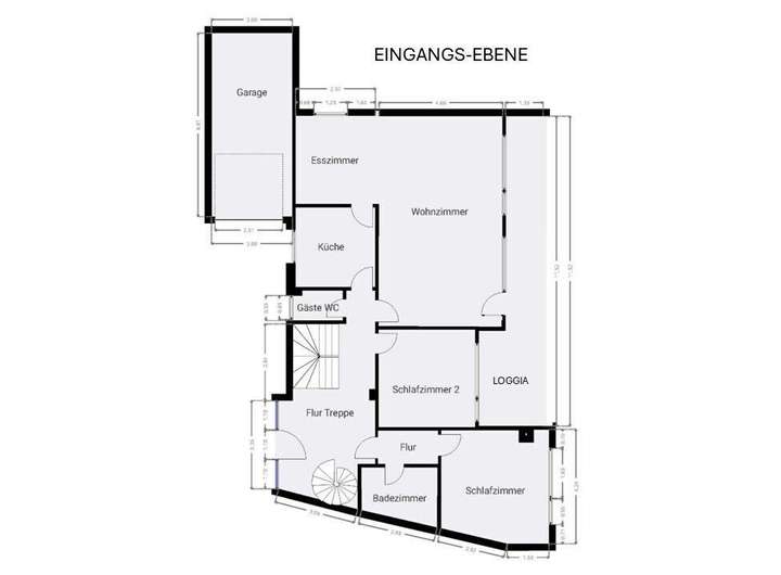 Großzügiger Eingangsbereich mit Zugang zum repräsentativen Wohnzimmer mit nach Süden ausgerichteter Loggia + angrenzendem Esszimmer + Arbeitszimmer + Schlafzimmer - alle Zimmer mit weitem Blick zum Rheintal + Küche + Badezimmer + Gäste-WC + zwei Treppen in die untere Ebene zu jeweils einem abgetrennten Wohnbereich