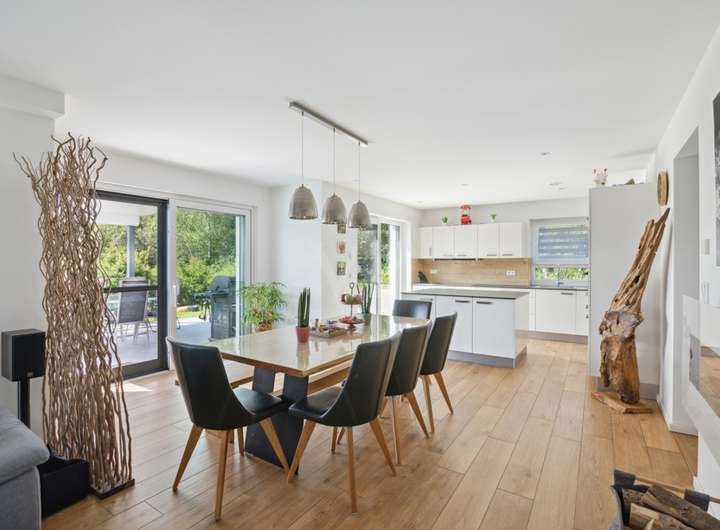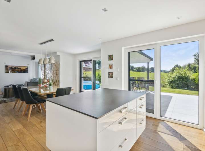 Auf direktem Weg gelangen Sie zum Herzstück - dem lichtdurchfluteten Wohn-/Ess- und Kochbereich.